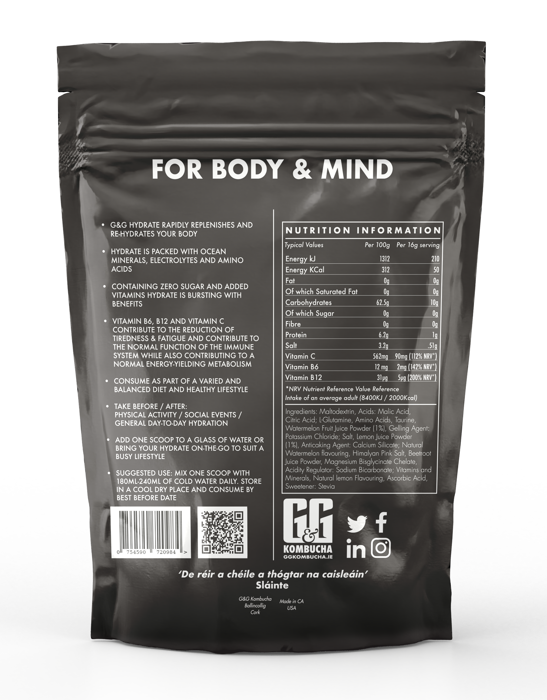 Rehydrate with G&G Hydrate. Each 16g scoop is packed with all 6 essential electrolytes, amino acids (3 types), *L-Glutamine 1,000mg, magnesium, and your daily recommendation of Vitamins C, B6, 200% of your B12 and beetroot powder. All natural ingredients.